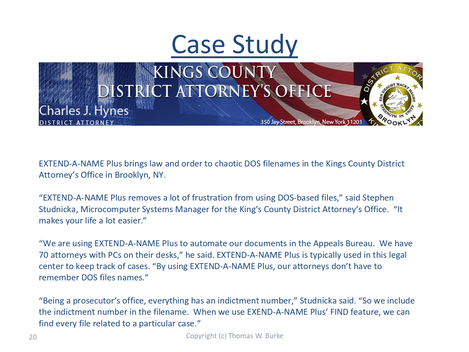 World Software was and is very committed to presenting Case Studies because they validate our products and its use in the real world. Case studies were and are essential building blocks of our Company. In the first of three Case Studies we present the comments from the Brooklyn DA's Office. The then District Attorney, Liz Holtzman, was herself a customer and user of our Extend-A-Name before she became the Brooklyn DA. She then had Extend-A-Name Plus installed throughout her organization. Thus we had a 160-user Extend-A-Name Plus installation on a 3COM network. Extend-A-Name Plus did indeed bring law & order to finding the documents at the Brooklyn DA's office.