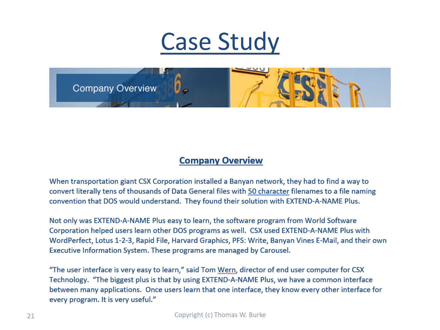 In the CSX Case Study, Tom Wern, highlights the biggest benefit of using EXTEND-A-NAME Plus namely- it provided a "common file interface between many applications."